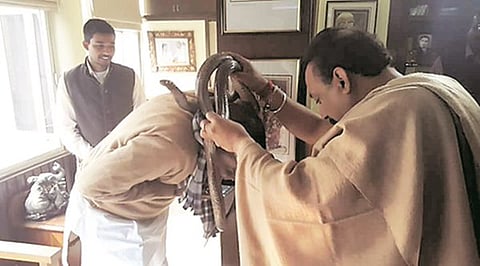 #Bihar education minister blessing other with snake. #JungleRaj with #junglee practices pic.twitter.com/8Ebk7P0HnK