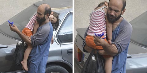 The touching pictures showed Abdul, a single father of two, holding up pens on a roadside on the southern outskirts of Damascus while holding his sleeping four-year-old daughter, Reem.