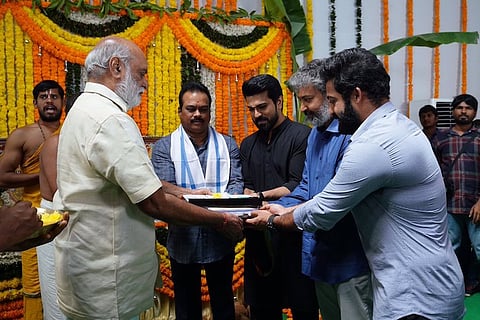 The film’s pooja was graced by veteran director K Raghavendra Rao, who is Rajamouli’s guru, and by Mega Star Chiranjeevi, Ram Charan’s father.