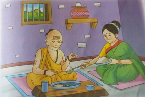 This particular illustration however got flak not just for how it depicted Thiruvalluvar, but also for what it said about his wife Vasuki. The picture shows Vasuki serving food for a young Thiruvalluvar and asks children if they know about the wife. The accompanying text says, "Thiruvalluvar was a world-famous Tamil-speaking poet and philosopher. Thiruvalluvar's wife's name was Vasuki. She was a woman who grew up in the domestic ways of a Tamil family. She would always obey her husband and would work day and night in his work and service. Vasuki performed her duty all his life,” said the text.