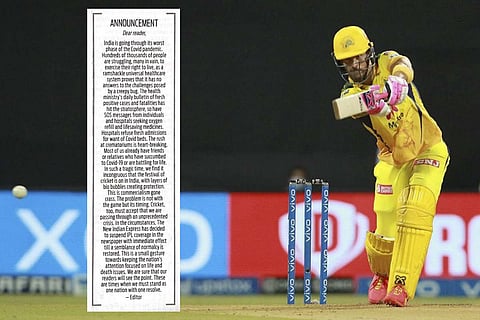 “In such a tragic time, we find it incongruous that the festival of cricket is on in India, with layers of bio bubbles creating protection. This is commercialism gone crass. The problem is not with the game but its timing. Cricket, too, must accept that we are passing through an unprecedented crisis. In the circumstances. The Sunday Standard and The Morning Standard will suspend IPL coverage in the newspaper with immediate effect till a semblance of normalcy is restored. This is a small gesture towards keeping the nation's attention focused on life and death issues. We are sure that our readers will see the point. These are times when we must stand as one nation with one resolve,” the letter added.