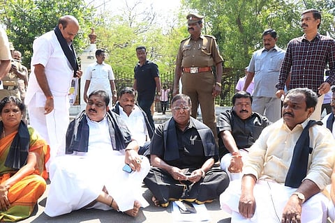 Thursday is the second day of sit-in protest organised Puducherry CM Narayanaswamy against Kiran Bedi. The main reason for the protests was alleged interference by the LG in Puducherry’s administration. Among the 40 odd protestors currently sitting before the Gates of the Raj Nivas are CM Narayanaswamy, fully clad in black, Public works Minister A Namassivyam, Health, Tourism, Aviation and Fisheries Minister Malladi Krishna Rao, Industries and Transport Minister Shahjahan, Education and Agriculture Minister Kandasamy and MLAs from DMK and INC are also protesting outside the Raj Nivas. They demand an assurance from the Lieutenant Governor that she will not interfere in administrative issues of the city.