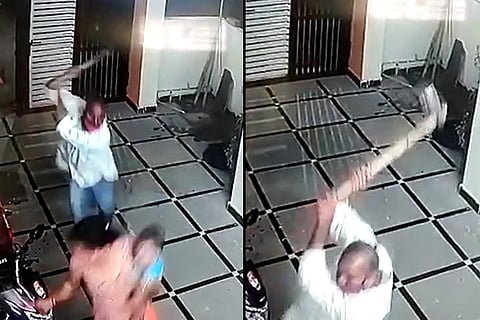 At 6.30 pm on Monday, holding a baby in her arms, 28-year-old Vimala was standing at the gate of her house talking to another woman. Suddenly a man in a white shirt arrives on the scene and starts attacking her with an axe. Vimala instinctively uses her hand to prevent any blows to her and the baby, and immediately runs back into the house. The armed attacker, identified as Rahul Goud, bolts from the scene after others arrive to confront him.
