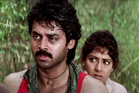 Unusual for its time, the story is told from the female character's perspective. When this is rare even now, imagine a film in the '90s breaking the mould! There aren't any special introduction shots for either of the leads. However, Sridevi's Satya is the first to make an entry, and Chandu (Venkatesh) is introduced towards the interval point without any of the mandatory elevation reserved for male stars. But though the film breaks some gender norms, Kshana Kshanam is still about a male saviour rescuing a damsel in distress.