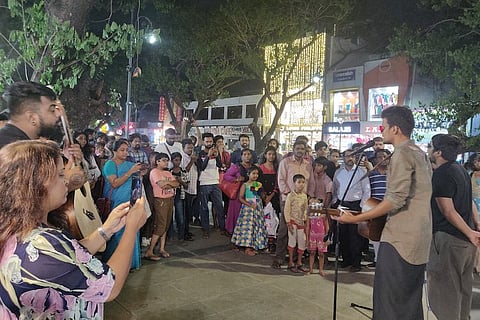 A group of youngsters strumming and tuning their guitars on the newly inaugurated Pedestrian Plaza in Pondy Bazaar drew a few curious looks. When the mics and speakers were being set up outside Kairasi Store, a small crowd began gathering. On Sunday, many unassuming shoppers at Panangal Park in T Nagar, Chennai were in for a sweet surprise.