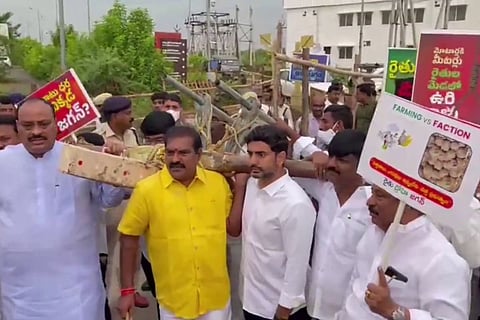 The opposition Telugu Desam Party (TDP) on Monday, September 19, tried to lay siege to Andhra Pradesh Legislative Assembly triggering mild tension in the area. The protest by leaders and workers of TDP's farmers’ cell led to chaos, as even the ministers' convoys were stuck in traffic jams. The protesters took the police by surprise by trying to advance towards the Assembly building after scaling the walls of the electricity sub-station. TDP farmers' cell president M Srinivas Reddy and other leaders were stopped by the police, followed by a heated argument between the two sides.
