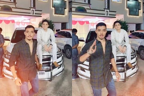 A grandson of Telangana Home Minister Mahmood Mohammed Ali has landed in a soup by appearing in a TikTok video, sitting atop a government vehicle, while his friend lip-syncs a film dialogue threatening a police officer.