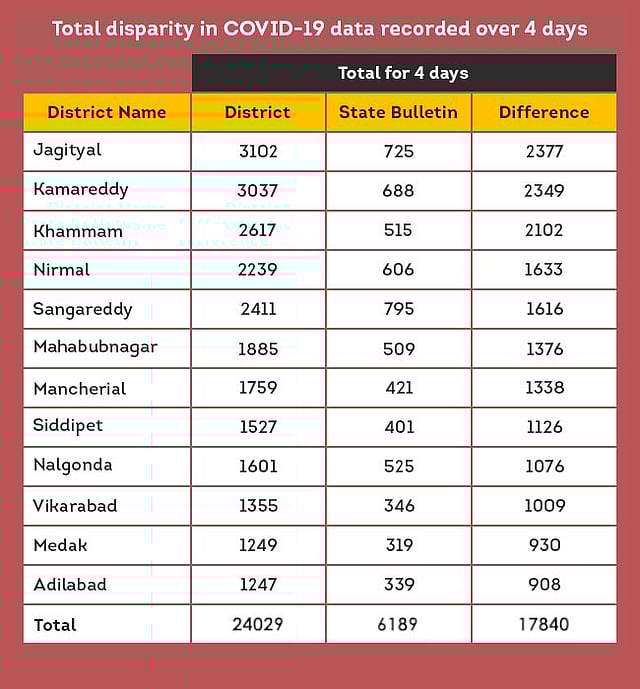 Let’s compare the discrepancies between the state’s official bulletin and the data reported by the various districts. The thirteen districts are - Jagityal, Kamareddy, Khammam, Nirmal, Sangareddy, Mahabubnagar, Mancherial, Siddipet, Nalgonda, Vikarabad, Medak and Adilabad.
