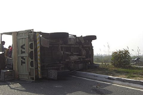 The three-wheeler overturned and was hit by a lorry coming from the other side near Jocil Company at Dokiparru village under Medikondur mandal of the district yesterday, Deputy Superintendent of Police Srinivasarao said.
