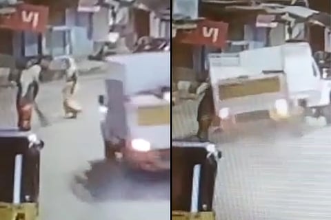 Two women, including a sanitation worker, were killed in Telangana’s Sangareddy district after a speeding Bolero pickup truck rammed into them, while the driver was trying to make a right turn. The horrific incident occurred at Ryakal Road in Narayankhed town and was caught on CCTV camera. The visuals show that the Bolero speeds into the frame, and rams into the two women who were on the side of the road, causing them to be thrown off due to the impact. The pickup van does not stop after hitting them, but comes to a halt a little distance ahead after crashing into a shop.