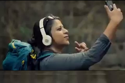 The video begins with the prayers and chants of the men in the company of two traditionally dressed women in mundum neriyathum, before they set off for Sabarimala. In parallel, visuals of a young woman wearing lipstick, packing a backpack and going off to Sabarimala is shown, to changing background music. As the barefoot men are about to climb a set of stairs – apparently representing the famous 18 steps to the Ayyappa shrine in Sabarimala – the woman passes them by, wearing shoes and headphones, clicking a selfie and has a police escort. A news clip is then played in the background – the police cleared the way and the women prayed and returned in 10 minutes, it said. The two traditionally dressed women see this clip and look shocked.