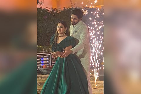 Wearing a forest-green draped skirt with a ruffled blouse, actor-producer Niharika Konidela rocked the dance floor with her fiance Jonnalageda Chaitanya, who wore a cream-coloured embroidered Sherwani, on Monday. The duo danced to her uncle Chiranjeevi’s popular song from Bavagaru Bagunnara at their sangeet at the Udaivilas Palace in Udaipur. The couple is set to marry at the same venue on December 9.