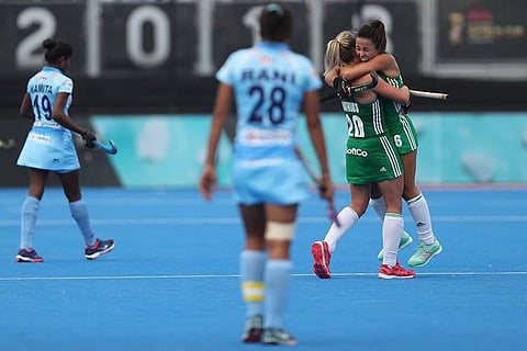 India won their fourth penalty corner in the 38th minute, but Ireland's McFerran made a diving save on her right to deny the Indian defender Gurjit.