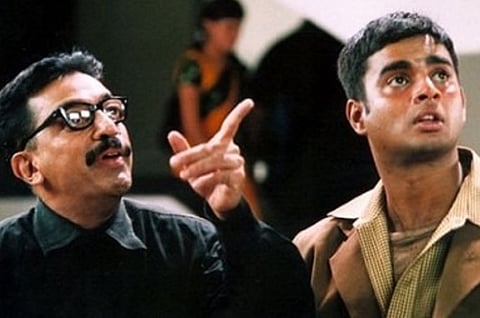 Madhavan’s infectious energy and comic timing helped the movie a great deal. It is not easy to match a powerhouse of talent like Kamal Haasan. But Madhavan nailed it in the scene where Arasu gets to know that Nalla doesn't have a family and then asks him to be on his side always as a brother. In response to this, Kamal Haasan pauses for a few seconds, gasps and stutters, when he asks - “But why you didn't tell me this before? ” What a terrific combat between two fine acting moments!