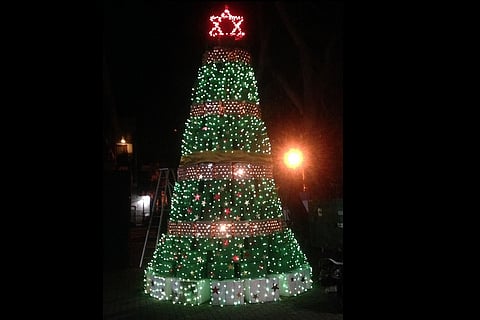 The church has a nine year old tradition of keeping Christmas eco-friendly. While the first year saw an 8-feet tree made of motorcycle tyres, the members experimented with a number of items including waste cloth, plastic bottles and cassette tapes in the later years.