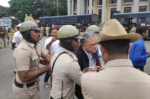 The detentions from Town Hall and Mysuru Bank were made as the protestors had gathered despite orders prohibitory orders being in place in the city. Heavy police presence marked the area since Thursday morning, including 100 policemen and three Karnataka State Reserve Police vehicles. The first wave of protesters had gathered around 10.45am on Thursday while the second batch came at 11 am. Once they were in substantial number and started speaking to the media, they were detained by the police.