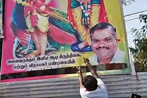 On Thursday morning, several members of the Praveen Shetty faction of KVR carried out a protest on Tannery Road in Bengaluru. The members of this Kannada outfit marched up to the flex banner of BBMP Corporator Elamalai and tore the parts of the banner containing text in Tamil.