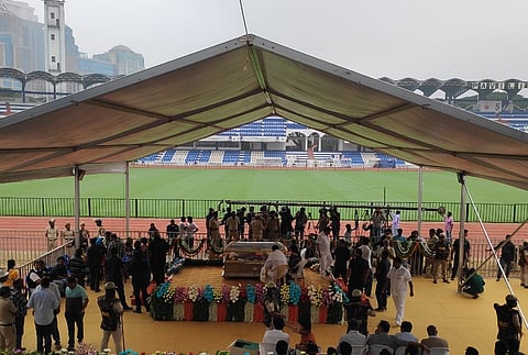 The mortal remains of the politician-actor have been brought Kanteerava Stadium in Bengaluru for the public to pay the last respects to their leader. A posse of 2,000 police personnel have been deployed and traffic restrictions have been put in place as part of this.