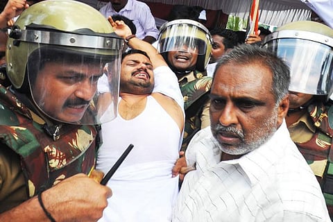 The protest turned chaotic as police threw stun grenades at the venue where Youth Congress leaders Dean Kuriakose and C.R. Mahesh were holding a hunger strike against the fee hike. The situation turned violent for a while as police lathi charged Youth Congress workers who pelted stones at them.