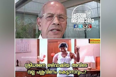 This meme has actor Sreenivasan wondering if Sreedharan was excluded to tie some cows on the dais.