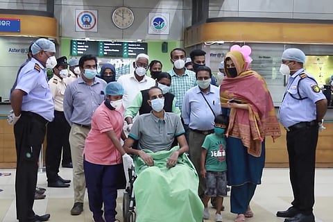 As the hospital staff helped Noufal, who now moves with the help of a wheelchair, into a car, he waved at everyone along with his wife and son, probably happy to finally leave to his house, surviving the tragic air crash.