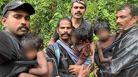 Pledging their own lives, four forest officers in Kerala undertook a dangerous four-hour trek in the steep and rocky terrain of Attamala in Wayanad to rescue a tribal family of four, including three children aged between one and four. The rescue operation has earned praise from Chief Minister Pinarayi Vijayan, who said the act was a reminder that “Kerala's resilience shines brightest in the darkest times.” The family was stuck atop the hill after the devastating landslides in Wayanad, which claimed more than 200 lives so far and injured thousands.