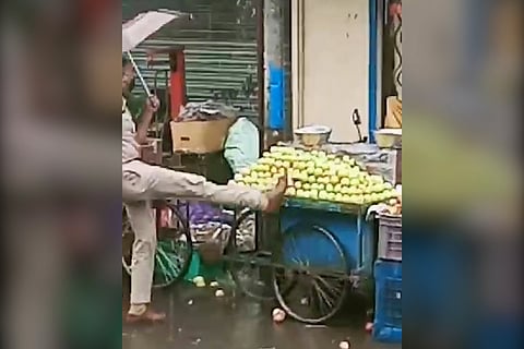 TNM dentified the street vendor who faced the mistreatment as Sajid, a native of Kannur. The policemen in the video can be heard screaming at the street vendors asking them to move, which Sajid opposes. Though it is raining, the police remove the umbrella and one police man first kicks Sajid's cart making fruits topple down and then he pushes the cart again.