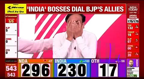 In what looked like an attempt at a cover-up, Axis My India chairman and managing director Pradeep Gupta broke down during a live television discussion on how the exit poll numbers projected by his agency and India Today turned out to be starkly off the mark. The exit polls, released on June 1 after polling concluded in the country for the 2024 Lok Sabha elections, had predicted over 400 seats for the Bharatiya Janata Party (BJP) led National Democratic Alliance (NDA). But the actual numbers completely contradicted this with the INDIA alliance putting up a good fight.