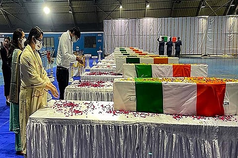 The mortal remains of #CDSGeneralBipinRawat, his wife Madulika Rawat and 11 others, who lost their lives in #TamilNaduChopperCrash yesterday, placed at Palam airbase. Their families pay last respects pic.twitter.com/xJ8u17r3Hc