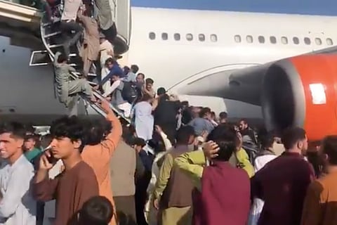 Chaos ensued as thousands of desperate residents rushed to the Kabul airport in an attempt to leave the country as the Taliban took over control of Afghanistan’s capital city on Sunday, August 15. Visuals from the Kabul airport showed crowds racing towards aircrafts that were taking off, others desperately trying to climb on aircraft, a crowd pushing and shoving its way up a staircase, trying to board a plane, with some people hanging off the railings, hoping to get out of the country even as gunshots are heard in the background.