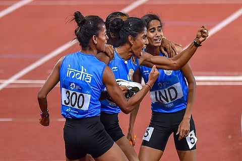 In the women's 4X400m event, the Indian quartet of Hima Das, Raju Poovamma, Saritaben Laxmanbhai Gayakwad and Vismaya Koroth registered a time of 3:28.72 to finish at the top of the podium.