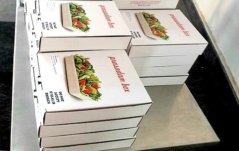 Special donors get their prasadam served to their office in a box. This box contains rice, dal, salad, and on some days, brownies. It’s a blessed box of treats.