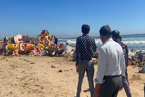 A day after Ganesha idols were immersed in Chennai, several idols, plastic waste, and other debris washed ashore at the Pattinapakkam beach on Monday, September 25. According to the Greater Chennai Corporation (GCC), debris that weighed up to 70 tonnes was collected from the shore by 140 sanitary workers from Sumeet Urbaser. A number of JCB excavators were also deployed for the purpose.