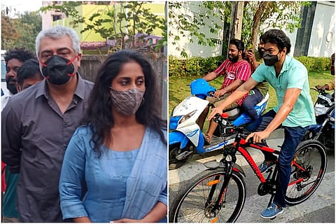 Actor Ajith was wearing same color mask while voting & actor Vijay was using same colored bicycle when he came to vote.#NoVoteForBJP pic.twitter.com/c8wkAXFfDA