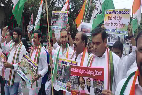 Amidst slogans targeting Chief Minister K Chandrashekar Rao (KCR) and Municipal Administration and Urban Development Minister KT Rama Rao (KTR), senior Congress leader Anjan Kumar Yadav called for KTR's resignation, citing improper management of the city.