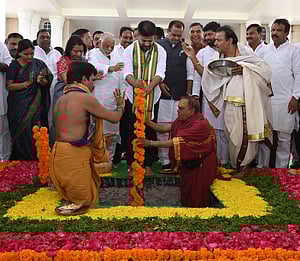 Amid the chanting of Vedic hymns by priests, CM Reddy participated in the rituals for ‘Bhoomi Puja’ to set up the statue of Telangana Talli.