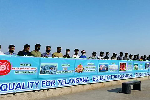 A group of youth also held up a banner at the Hussain Sagar Lake in protest. The banner posed several questions to PM Modi and used the hashtag #EqualityForTelangana. The group questioned the Prime Minister about job creation, ITIR for Telangana, Rail Coach Factory, Turmeric Board, Bayyaram Steel Factory and the setting up of an IIM in the state.