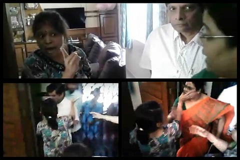 In a video of the incident that surfaced, Pushpalatha, the wife of professor Goranayak, is seen shouting and yelling at the officials standing outside her house.